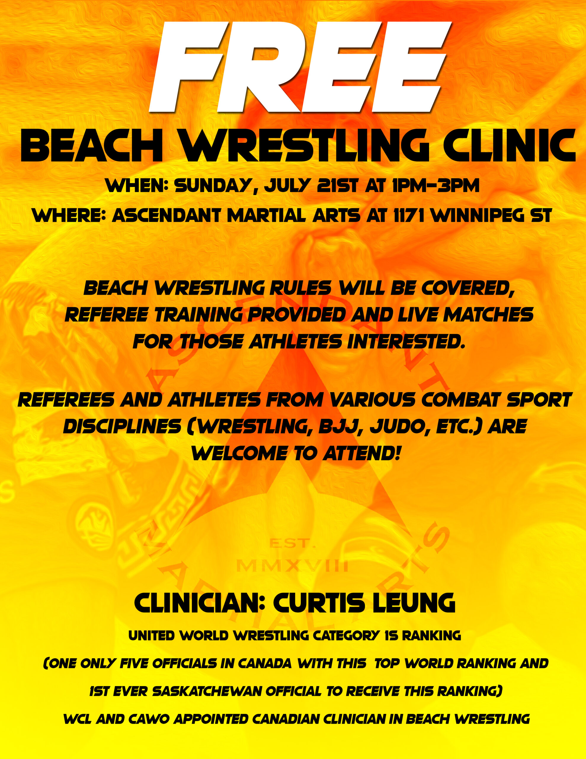 Beach Wrestling Referee Clinic July 11, 2024 | No Comments Beach Wrestling Referee Clinic 1:00 pm – 3:00 pmJuly 21, 2024 Ascendant Martial Arts1171 Winnipeg StreetRegina , Saskatchewan View Location View full calendar
