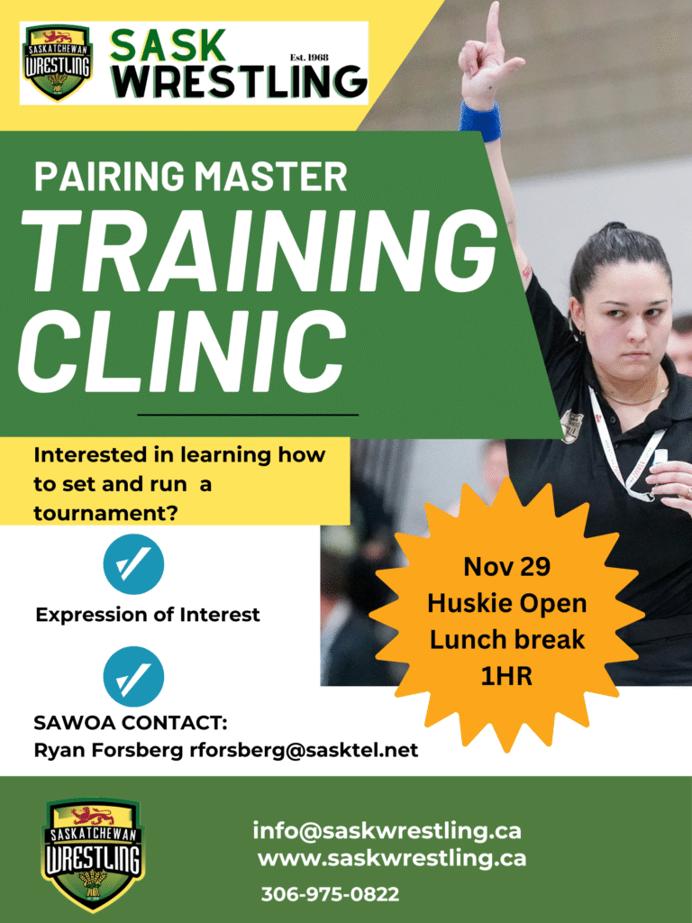Sask Wrestling is looking for interested people who would like to become a Pairing Master for our competition events. Pairing Masters are compensated for their time from SAWAO.