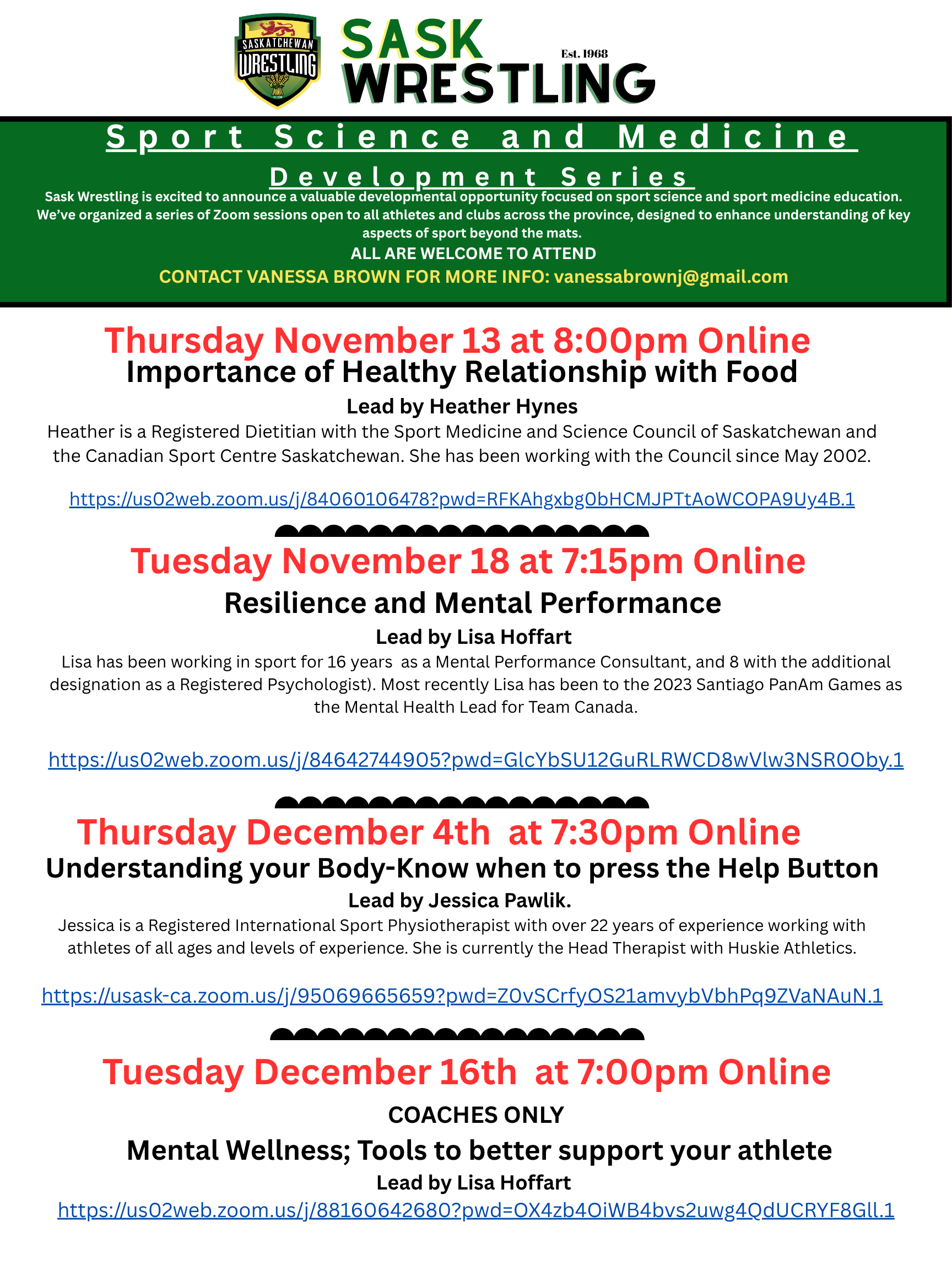 SAsk Wrestling is pleased to announce this years Sport Science and Medicine Series of workshops for all to participate in.